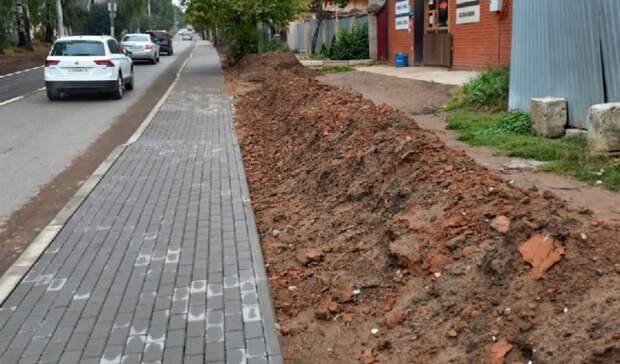 Этим летом на улице Совхозной появилась дорожка, выложенная брусчаткой. Сверху дорожки строители аккуратной горкой уложили грунт после выемки, который лежит до сих пор.